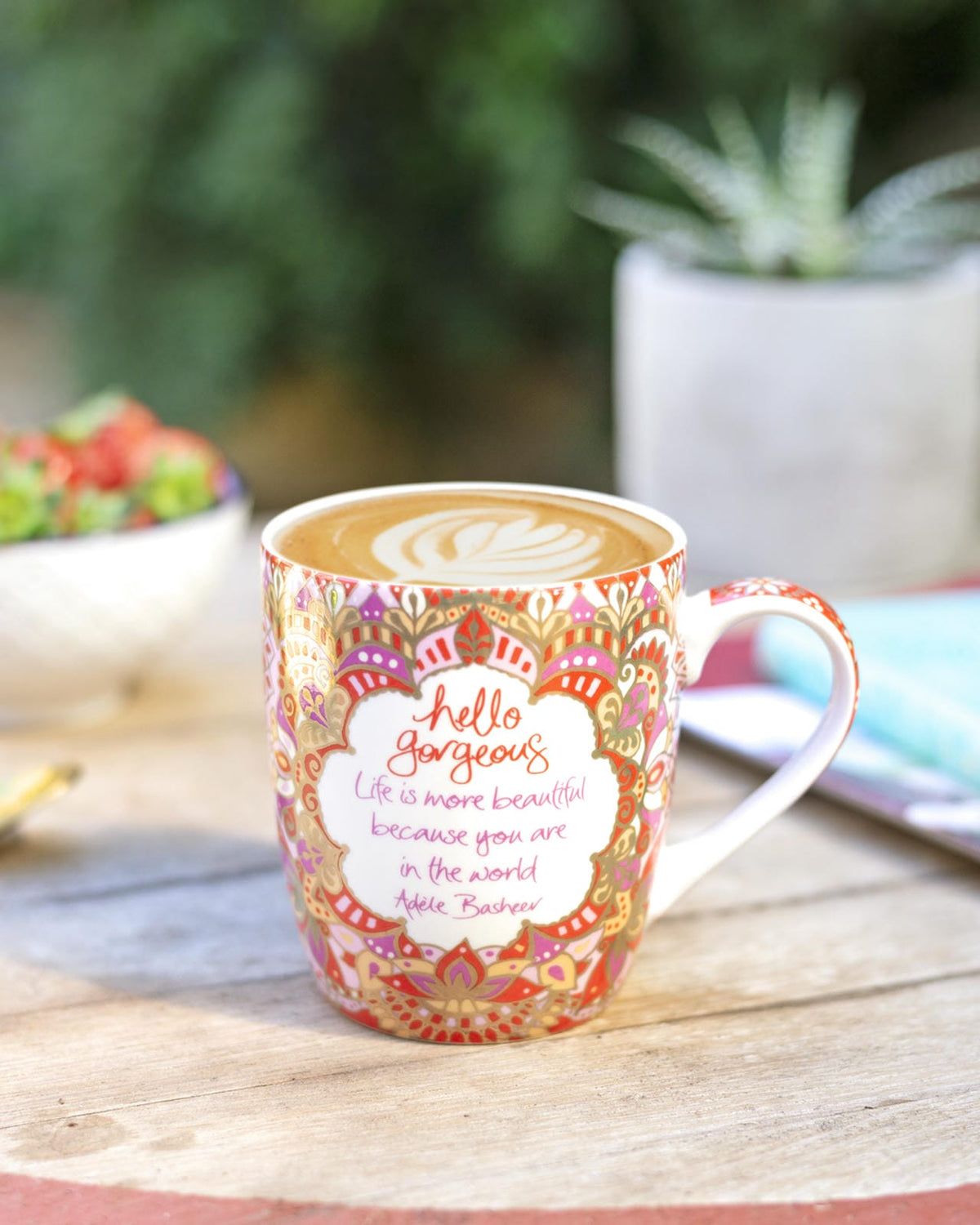Unit price perCelebrate the everyday with the Hello Gorgeous mug by Intrinsic — a beautifully illustrated porcelain mug wrapped in pink‑red‑purple hues, real gold detailing and the quote: “Hello Gorgeous – Life is more beautiful because you are in the world.”