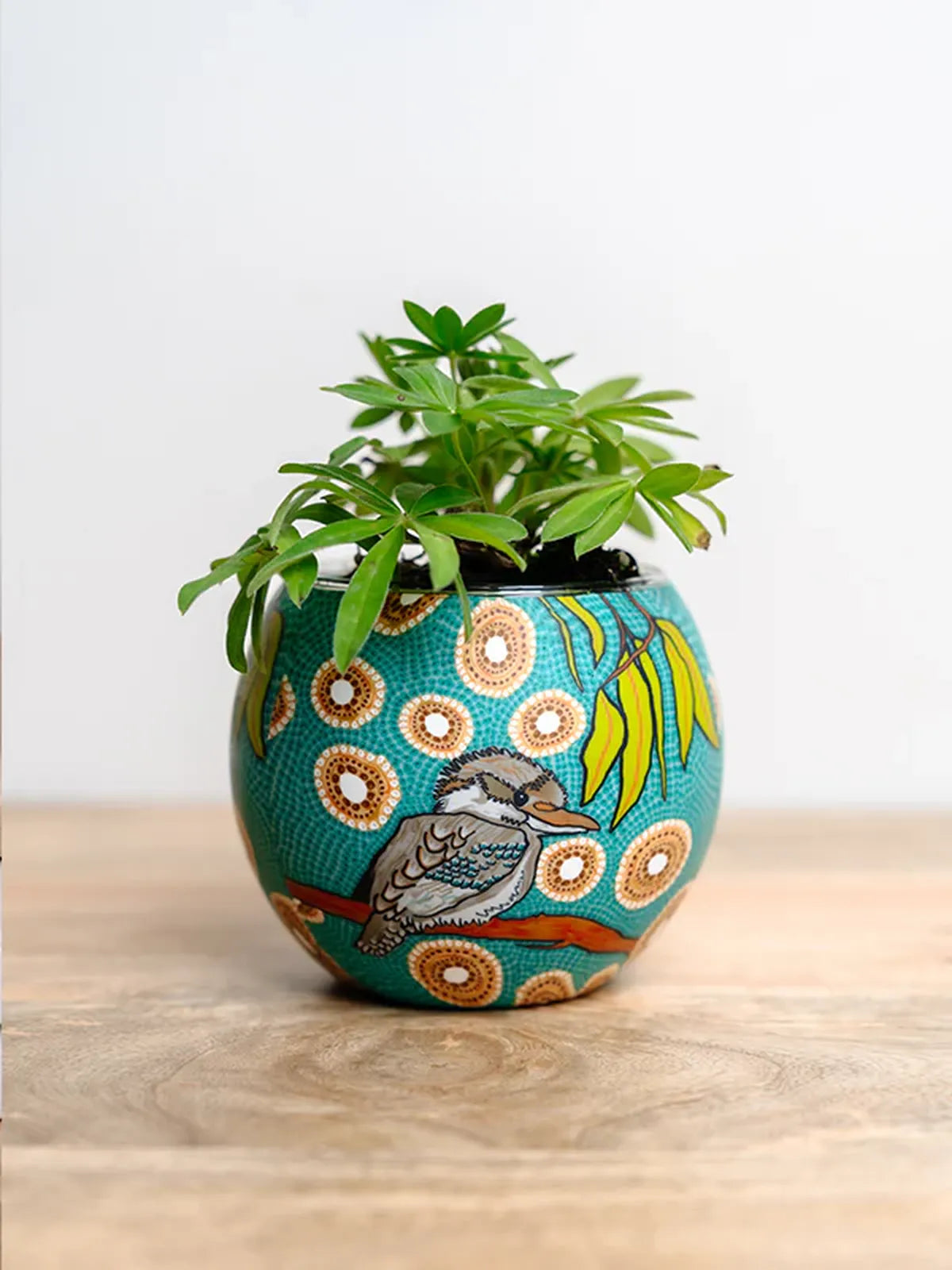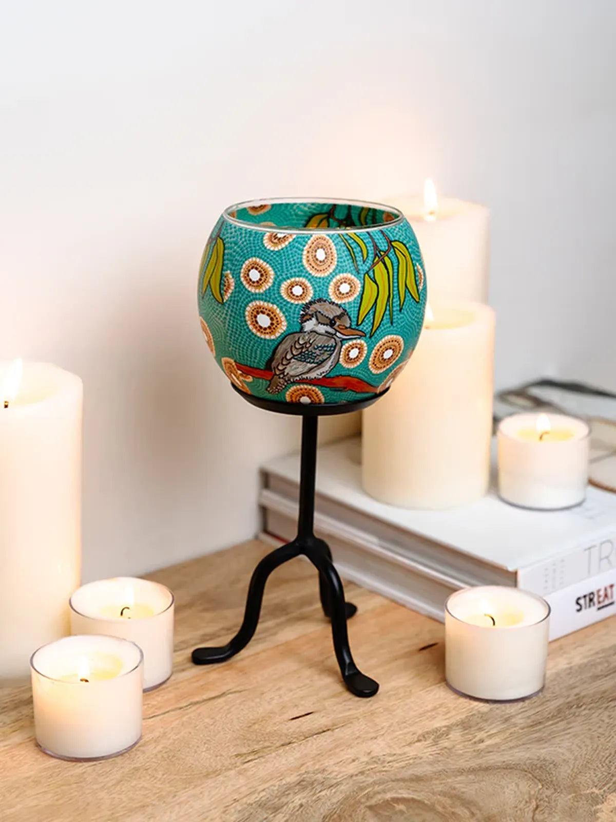 Unit price perThis beautifully crafted tealight candle holder brings the vibrant spirit of Australian nature into your home. Featuring the playful Kookaburra motif from First Nations artist Domica Hill, this glass + clay holder glows with warm ambient light when a tealight is placed inside — ideal for living rooms, bedside tables or gifting moments.