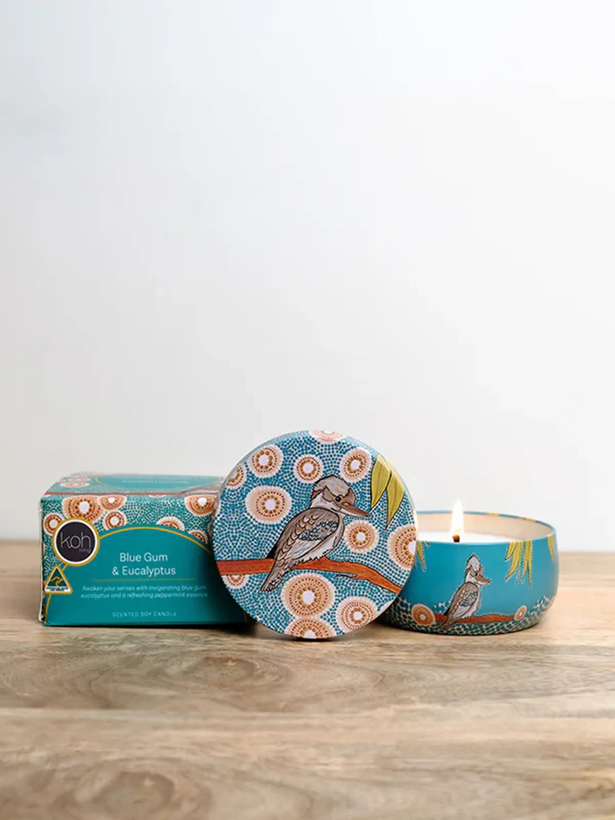 Unit price perSet the mood with this beautifully designed scented candle tin that captures the fresh essence of blue gum eucalyptus and a hint of peppermint. The 170 g candle is poured with 100% natural soy wax, features lead‑free cotton wicks and offers around 30 hours of burn time. It’s wrapped in Aboriginal artwork by Domica Hill, making it as visually striking as it is aromatic.